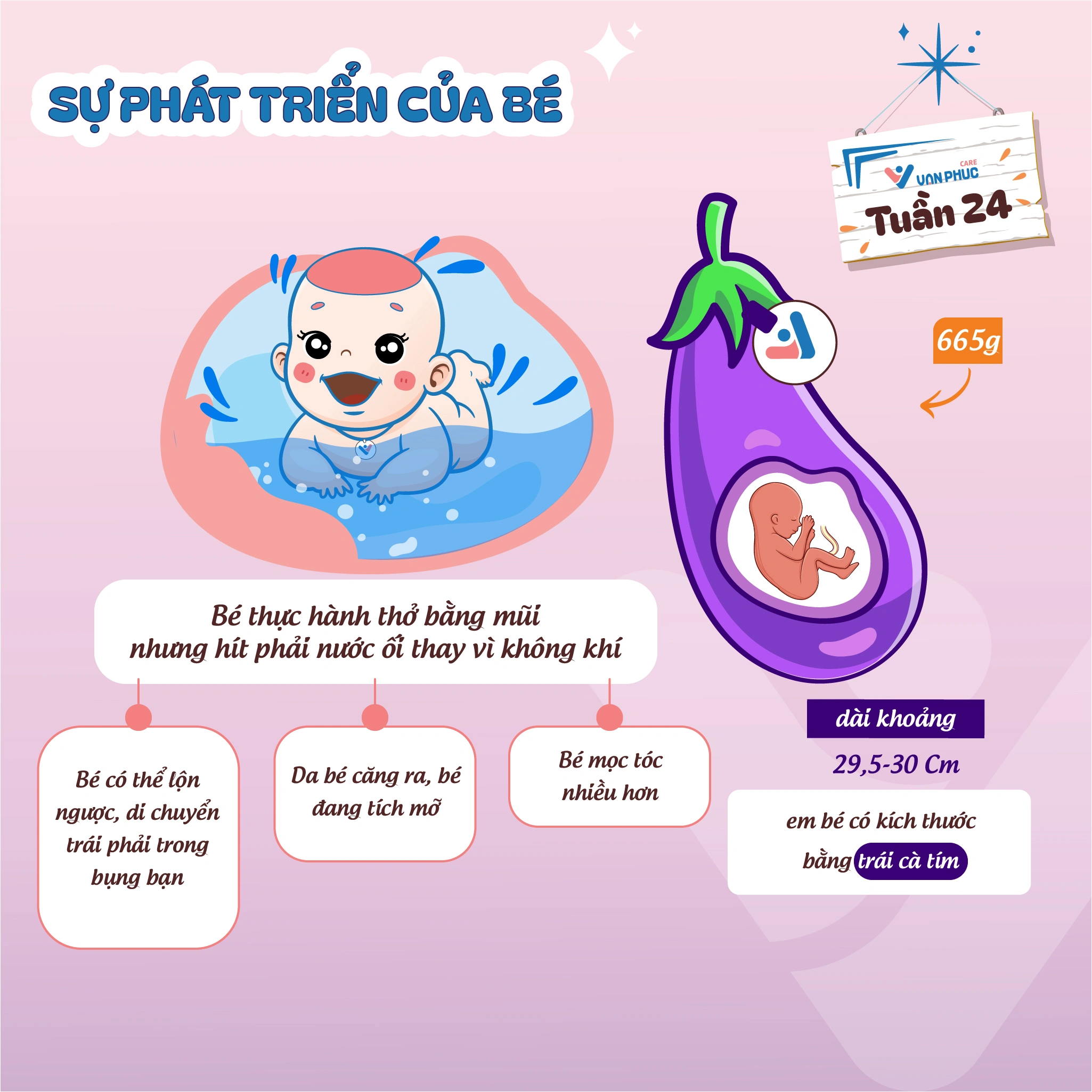Thai nhi 24 tuần thường nặng trong khoảng từ 600 đến 700 gram và dài khoảng 30 cm, tương đương kích thước một trái cà tím.