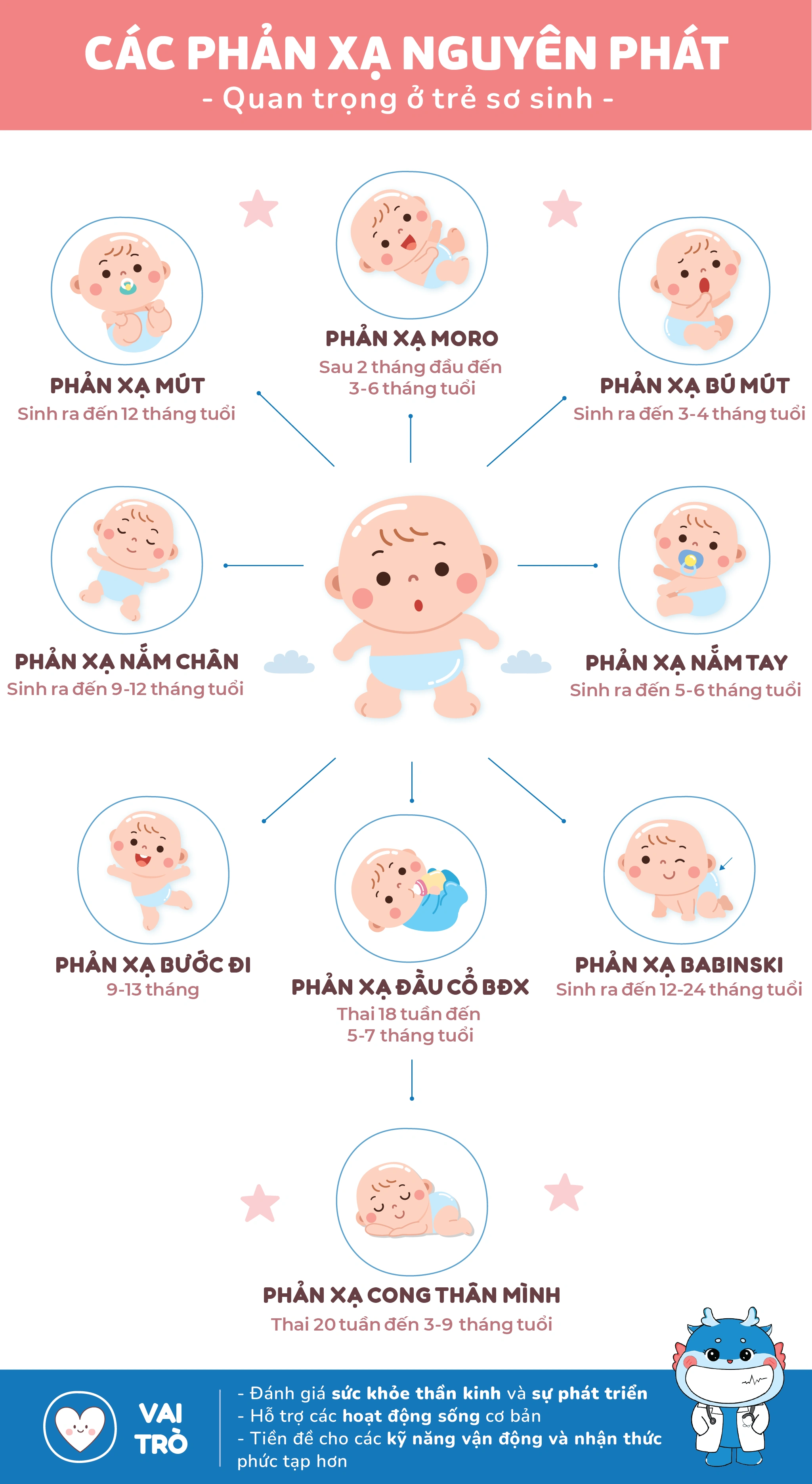 Vai trò trong sự phát triển: Những phản xạ này không chỉ giúp trẻ tồn tại mà còn là nền tảng cho sự phát triển vận động, nhận thức và cảm xúc sau này. Chúng giúp trẻ thực hiện các hành động như bú mút, nắm bắt, phản ứng với âm thanh lớn và chuẩn bị cho các kỹ năng vận động phức tạp hơn như bò, đi, đứng.