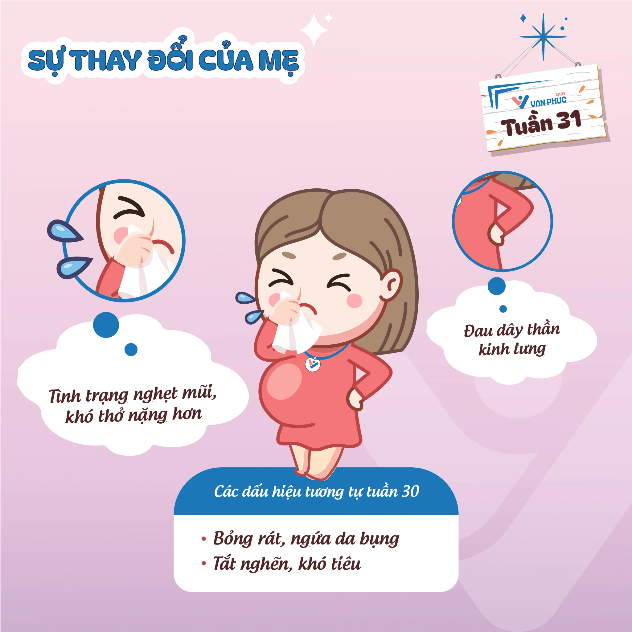 Sự phát triển của thai nhi 31 tuần kéo theo nhiều thay đổi trên cơ thể mẹ. Hầu hết các triệu chứng này đều liên quan trực tiếp đến sự phát triển khỏe mạnh của con.